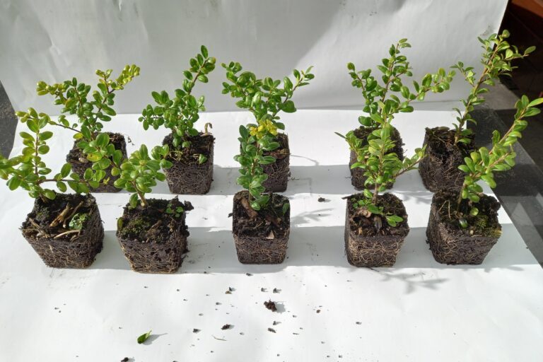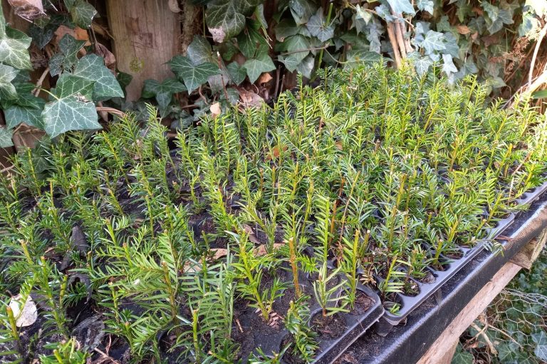 Taxus baccata stekken we in stektrays, waarna ze in de volle grond opgekweekt worden.
